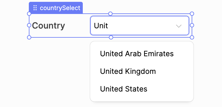Like the native HTML `<select>`, the values and rendered labels of the options may be different. In the country select examples above, ISO country codes like `AU` are used as values, while the visualized labels are the full country names like `Austria`. These values and labels are configured separately in the properties panel with the "Values" and "Labels" properties. Internally, these properties must have the following structure: