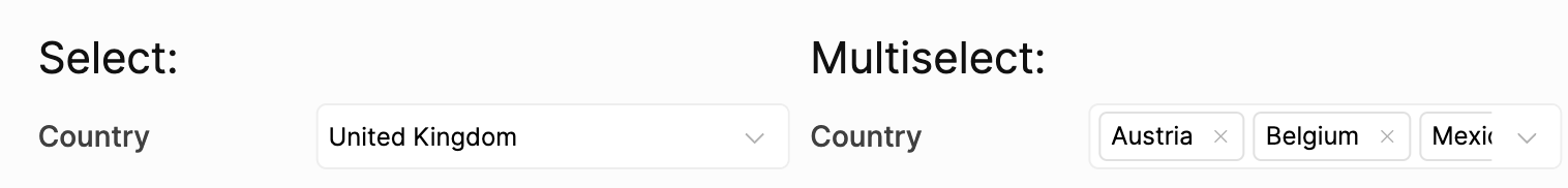 <figure><img src="https://1582137130-files.gitbook.io/~/files/v0/b/gitbook-x-prod.appspot.com/o/spaces%2FkTYtq8XZyg79paoHbd93%2Fuploads%2FmFQCIGtXgtimc01aXv4C%2Fimage.png?alt=media&#x26;token=496c541b-b0b6-4f79-b1a4-821aa2ef6388" alt=""><figcaption><p>Selected options in Select vs. Multiselect</p></figcaption></figure>