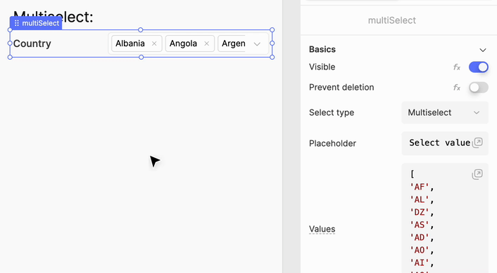 <table><thead><tr><th width="158">Property</th><th width="166">Type</th><th width="161">Default value</th><th>Behavior</th></tr></thead><tbody><tr><td>Alignment</td><td><code>'left' | 'center' | 'right'</code></td><td><code>'left'</code></td><td>Alignment of the label text next to the select.</td></tr><tr><td>Allow empty</td><td><code>boolean</code></td><td><code>true</code></td><td>Whether the select may have no option selected or not. When set to <code>false</code>, the user will not be able to deselect the last remaining option. It is  still possible in this case to clear the select programmatically, and to initialize it without any option in the "Default values" property.</td></tr><tr><td>Allow search</td><td><code>boolean</code></td><td><code>true</code></td><td>When set to <code>true</code>, the select offers to search for options.</td></tr><tr><td>Default values</td><td><code>Array&#x3C;string | number></code></td><td><code>[]</code></td><td>Values of the options that should be selected after initial app load. When the <code>reset()</code> API method is called, the selection is reset to the current values of this property. When used with a dynamic JavaScript expression, a change of dependencies updates the selection reactively (learn more about reactivity).</td></tr><tr><td>Disabled</td><td><code>boolean</code></td><td><code>false</code></td><td>Whether the select should be disabled. When disabled, the component is greyed out and the dropdown cannot be opened.</td></tr><tr><td>Label</td><td><code>stringWithJs</code></td><td><code>'Select'</code></td><td>Text label shown next to the select.</td></tr><tr><td>Labels</td><td><code>string[] | Record&#x3C;string, string></code></td><td><code>['First', 'Second', 'Third']</code></td><td>Rendered option labels. <a href="#values-and-labels">Learn more</a></td></tr><tr><td>Placeholder</td><td><code>stringWithJs</code></td><td><code>'Select value'</code></td><td>Placeholder shown in the select when no value has been selected yet.</td></tr><tr><td>Required</td><td><code>boolean</code></td><td><code>false</code></td><td>Whether at least one value must be selected when a surrounding form is submitted. Otherwise, form submission is aborted. <a href="../form#submitting-a-form">Learn more about form submission</a></td></tr><tr><td>Select type</td><td><code>'Select' | 'Multiselect'</code></td><td>Depends on chosen component type</td><td>Changes the component type to the chosen one. <a href="#select-vs.-multiselect">Learn more</a></td></tr><tr><td>Values</td><td><code>Array&#x3C;string | number></code></td><td>Numbers from 1 to 10</td><td>Option values. <a href="#values-and-labels">Learn more</a></td></tr></tbody></table>