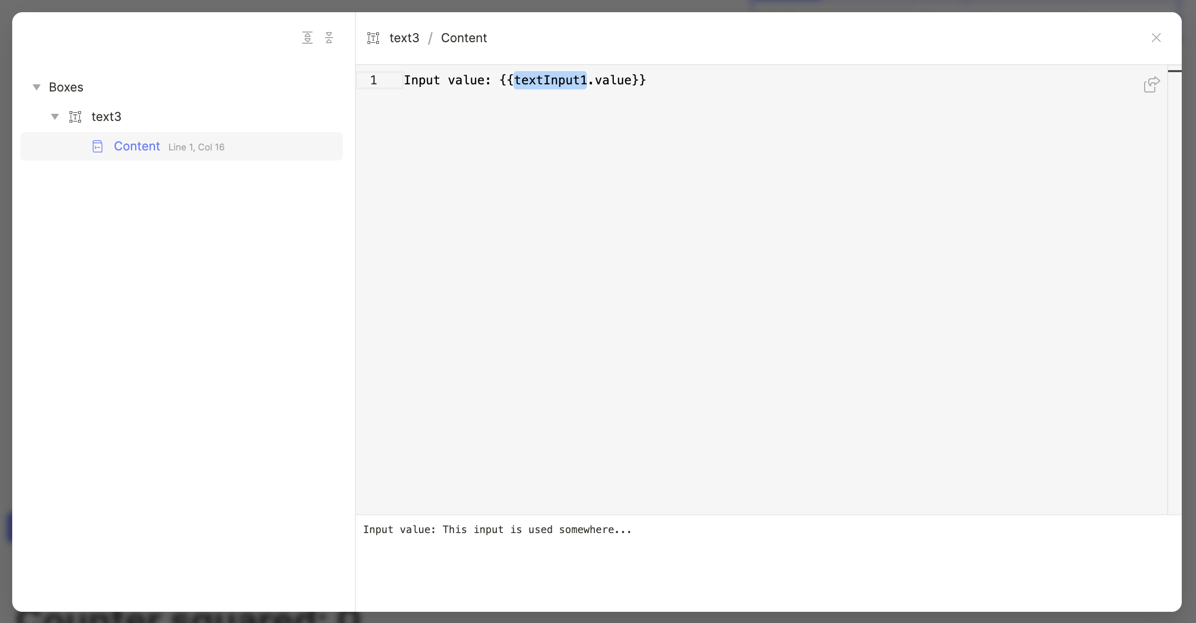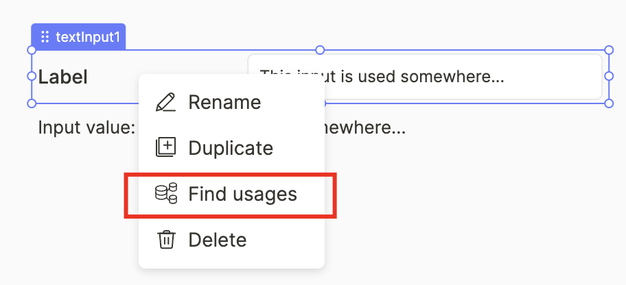 <figure><img src="https://1582137130-files.gitbook.io/~/files/v0/b/gitbook-x-prod.appspot.com/o/spaces%2FkTYtq8XZyg79paoHbd93%2Fuploads%2F4yHiUgFAq0C86i0hiuJj%2Fimage.png?alt=media&#x26;token=58751fb2-922f-4513-b2ee-e7895fc2b5ad" alt=""><figcaption><p>Displaying a single usage of the <code>textInput1</code> component</p></figcaption></figure>