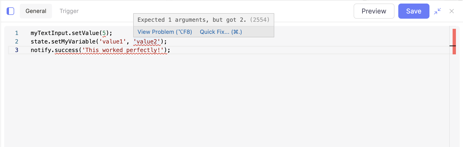* Ability to declare accepted types of action `args`, to highlight invocations of the `trigger` function with incomplete or wrong arguments, and to use `args` inside of an action in a typed manner